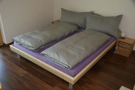 Schlafzimmer: Gemütliches Doppelbett (160x200cm), Nachttischlampen, Hocker (Kleiderablage), grosser Einbauschrank mit Tablaren und Kleiderstange inkl. genügend Kleiderbügel
